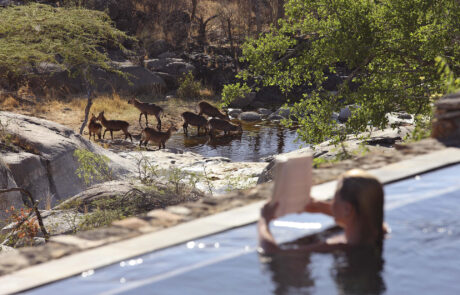 - The Signature Pool: An expansive swimming pool is dramatically set on a rocky outcrop, offering a stunning view over the natural springs below, where resident wildlife frequently comes to drink.