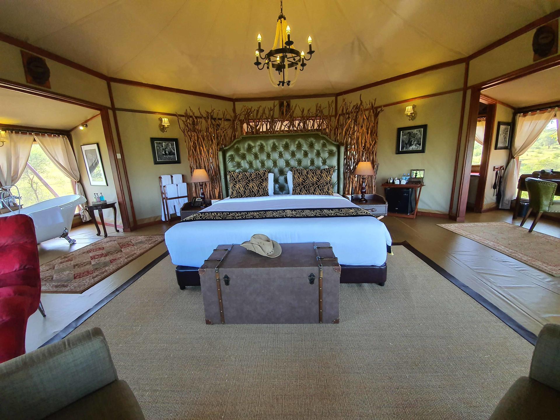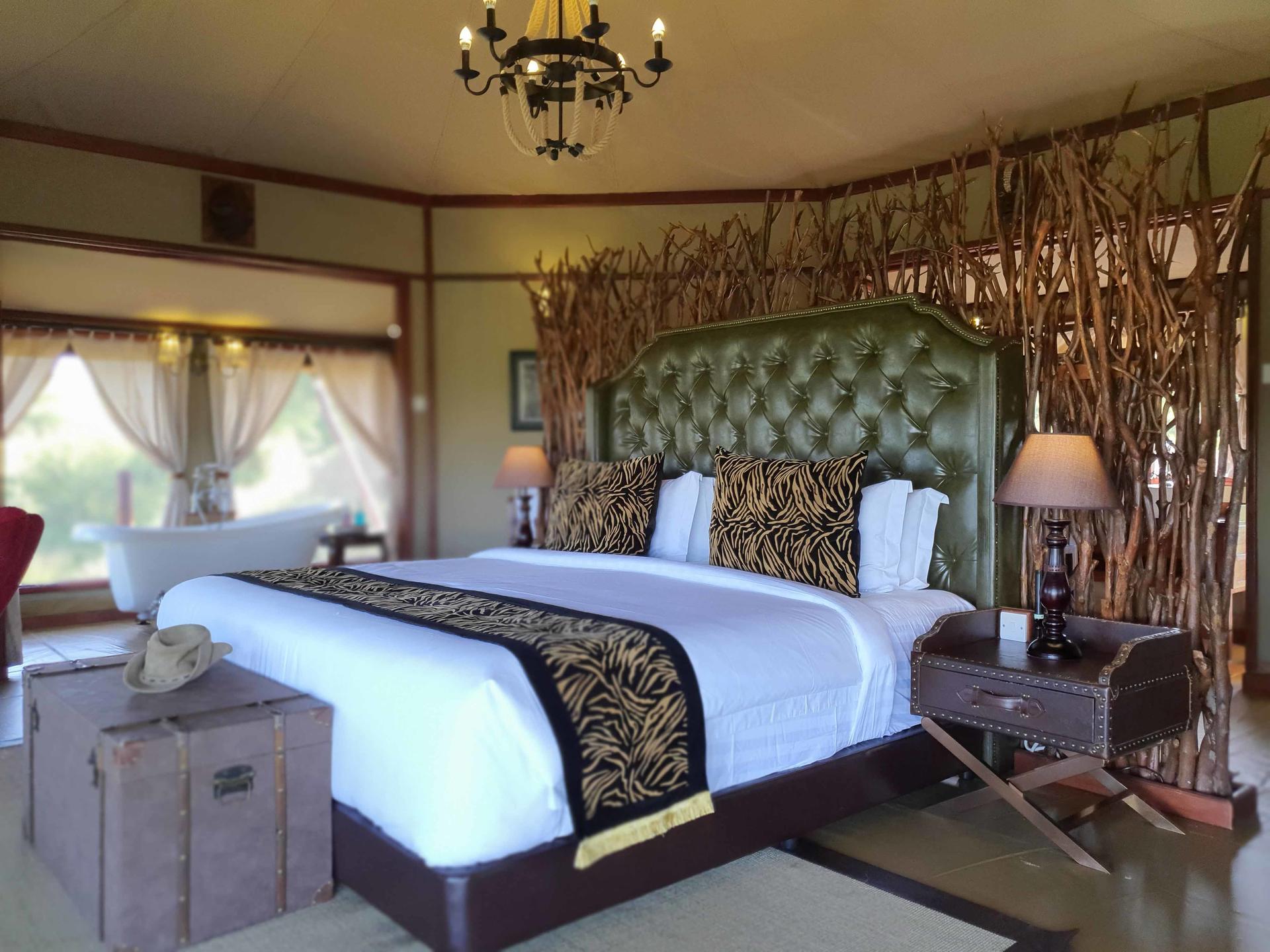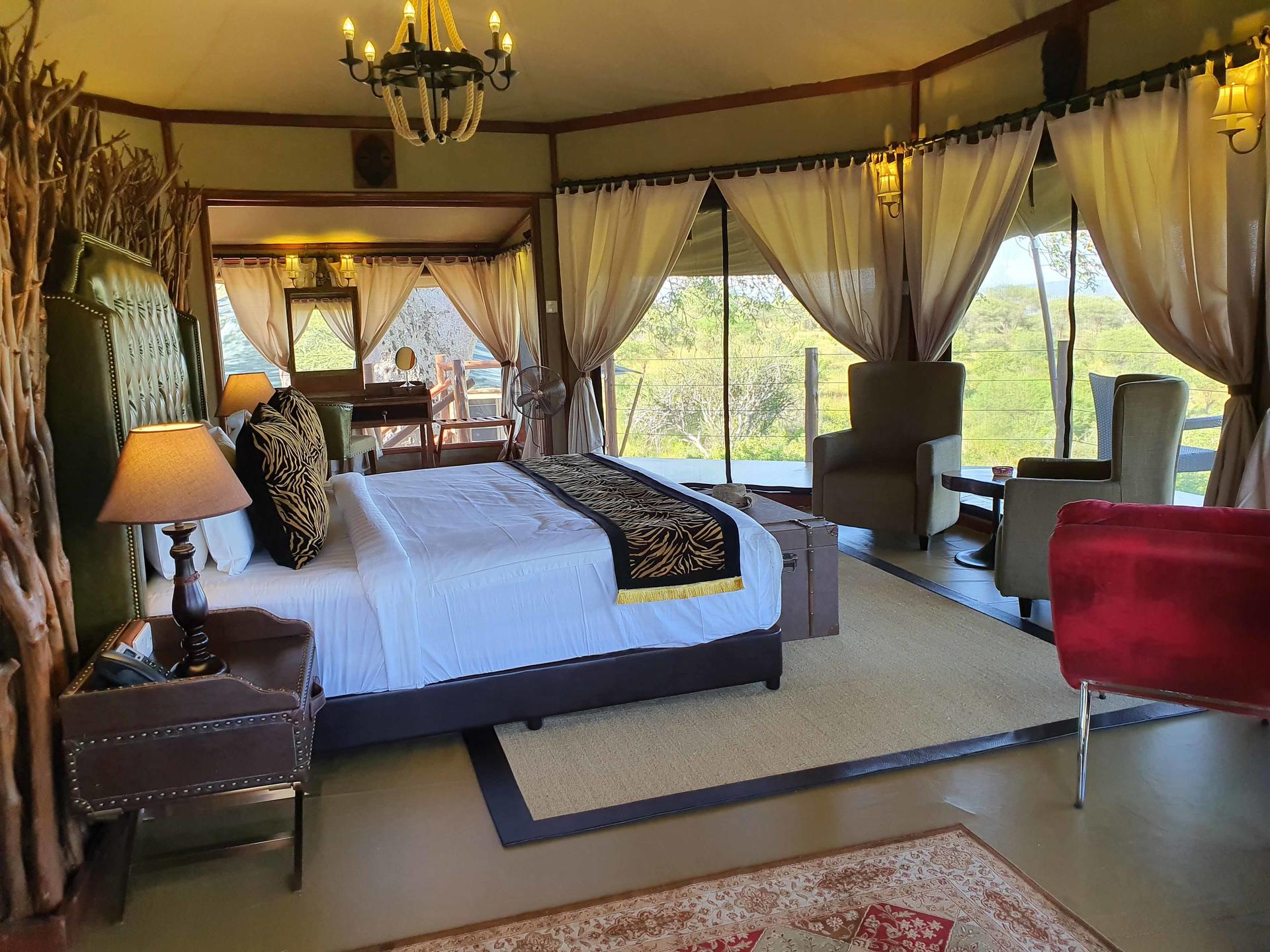 Each tent is designed for comfort and privacy, featuring luxury bedding and a full ensuite bathroom. A standout feature is the indoor and outdoor shower, allowing you to rinse off after a game drive while being completely immersed in nature. Every tent also has a spacious private veranda, perfect for relaxing and watching wildlife pass by. For families or groups, the lodge offers two interconnecting rooms.